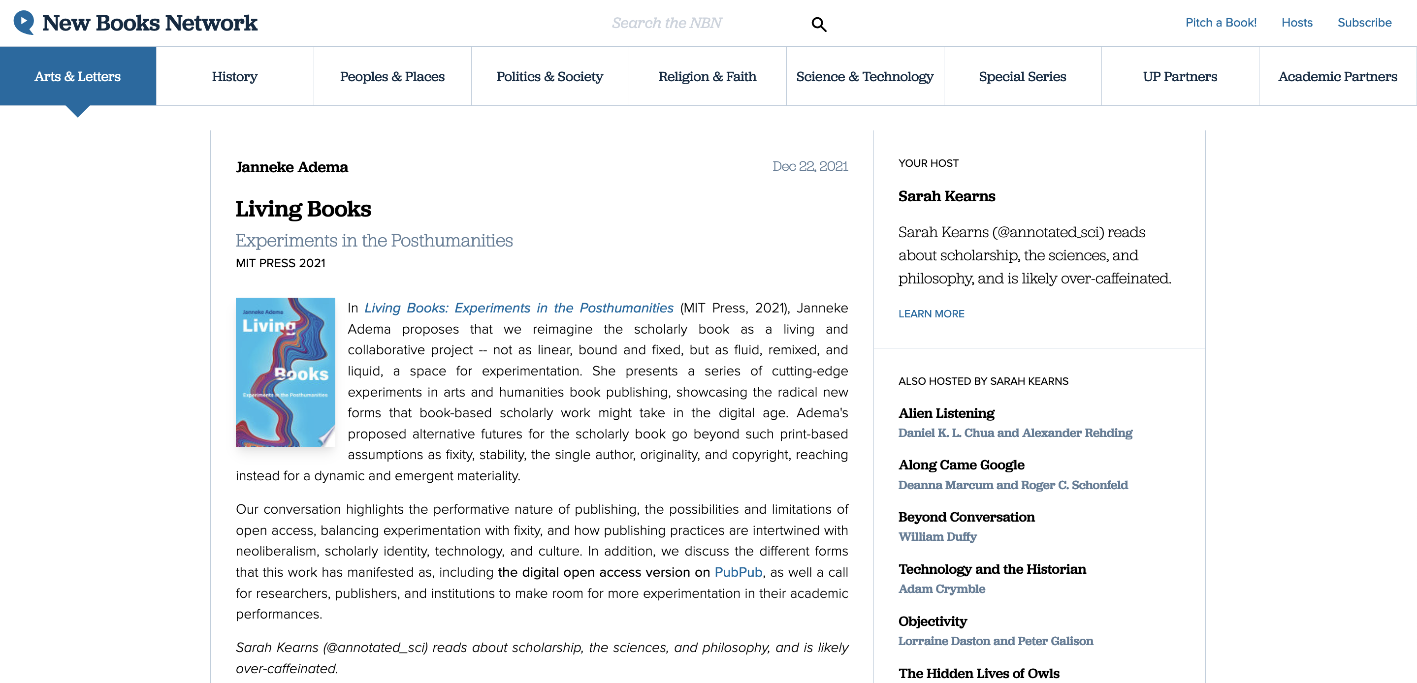 The wonderful Sarah Kearns, who has also been incredibly helpful in getting Living Books. Experiments in the Posthumanities (MIT Press, 2021) up on PubPub (opening the book up for annotations and comments), has conducted a podcast interview with me for the New Books Network about Living Books. You can listen to the interview here and find more information about our conversation underneath!