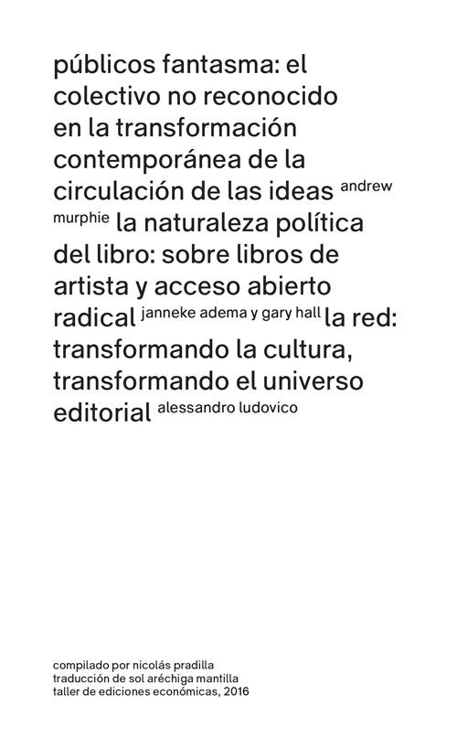 With Gary Hall, ‘La Naturaleza Politica del Libro: Sobre Libros de Artista y Acceso Abierto Radical’, in: Andrew Murphie, Alessandro Ludovico, Janneke Adema and Gary Hall, Circulación y resonancia I, ed. Nicolas Pradilla (Taller De Ediciones Economicas: 2016) Impresión risográfica, 1 tinta, 128 pp.  (This is a Spanish translation of’The Political Nature of the Book: On Artists’ Books and Radical Open Access’ (co-authored with Gary Hall), New Formations, Number 78, Summer 2013 , pp. 138-156). PDF
