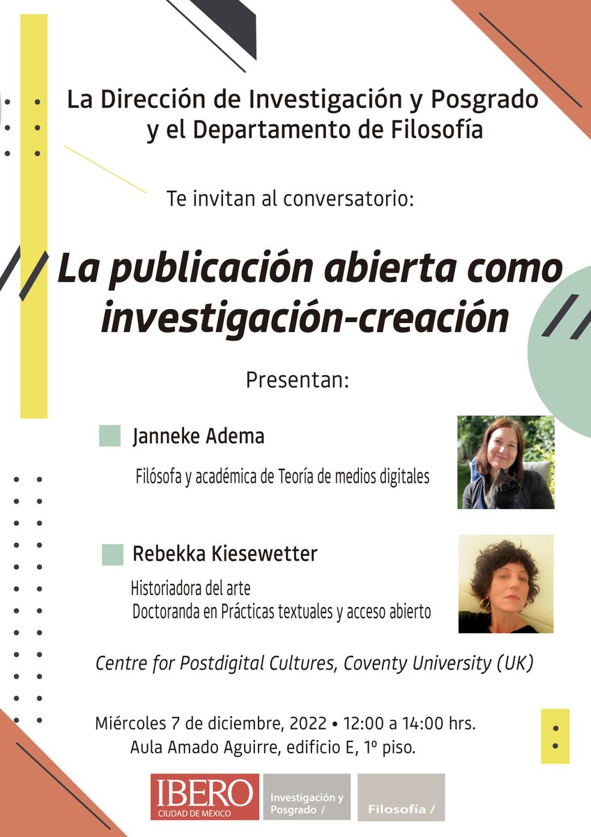 Invited panelist, La Publicación abierta como investigación-creación, with Gabriela Méndez Cota, Rebekka Kiesewetter, and Sandra Loyola. Universidad Iberoamericana, Departamento de Ciencias Sociales y Políticas, December 7th, Ciudad de México (MX)